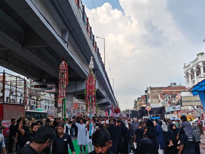 लखनऊ: पुराने लखनऊ में निकला चेहल्लुम का जुलूस मौलाना कल्बे जवाद ने जुलूस से पहले पढ़ी मजलिस के बाद गामज़ादा माहौल में निकाला चेहल्लुम का जुलूस इमामे हुसैन की याद में निकाला गया जुलूस हाय हुसैन या हुसैन की आवाजें हुई बुलंद! इमामे हुसैन की याद में फूट फूट कर रोए आजादार वहीं मातमी अंजुमनो ने कमा और जंजीर का किया मातम हजारों की संख्या में अकीदतमंद जुलूस में हुए शामिल! जुलूस विक्टोरिया स्टेट से अकबरी गेट नखास,बलौजपुरा, बाजार खाला हैदरगंज,बुलाकी अड्डा, होते हुए कर्बला तालकटोरा में होगा संपन्न पुराने लखनऊ में जगह-जगह पुलिस फोर्स रही तैनात वही चप्पे-चप्पे पर मुस्तैद नज़र आए पुलिसकर्मी सीसीटीवी कैमरा टीम और ड्रोन कैमरे से हुई जुलूस की निगरानी